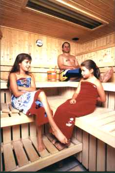 Sauna / Biodampfbad Unseren Hausgästen steht eine geräumige Sauna ( Biodampfbad und finnische Sauna) für 5-6 Personen zur Verfügung. Saunahandtücher können Sie sich bei uns ausleihen. Pro Person berechnen wir 6€ pro Saunatag |